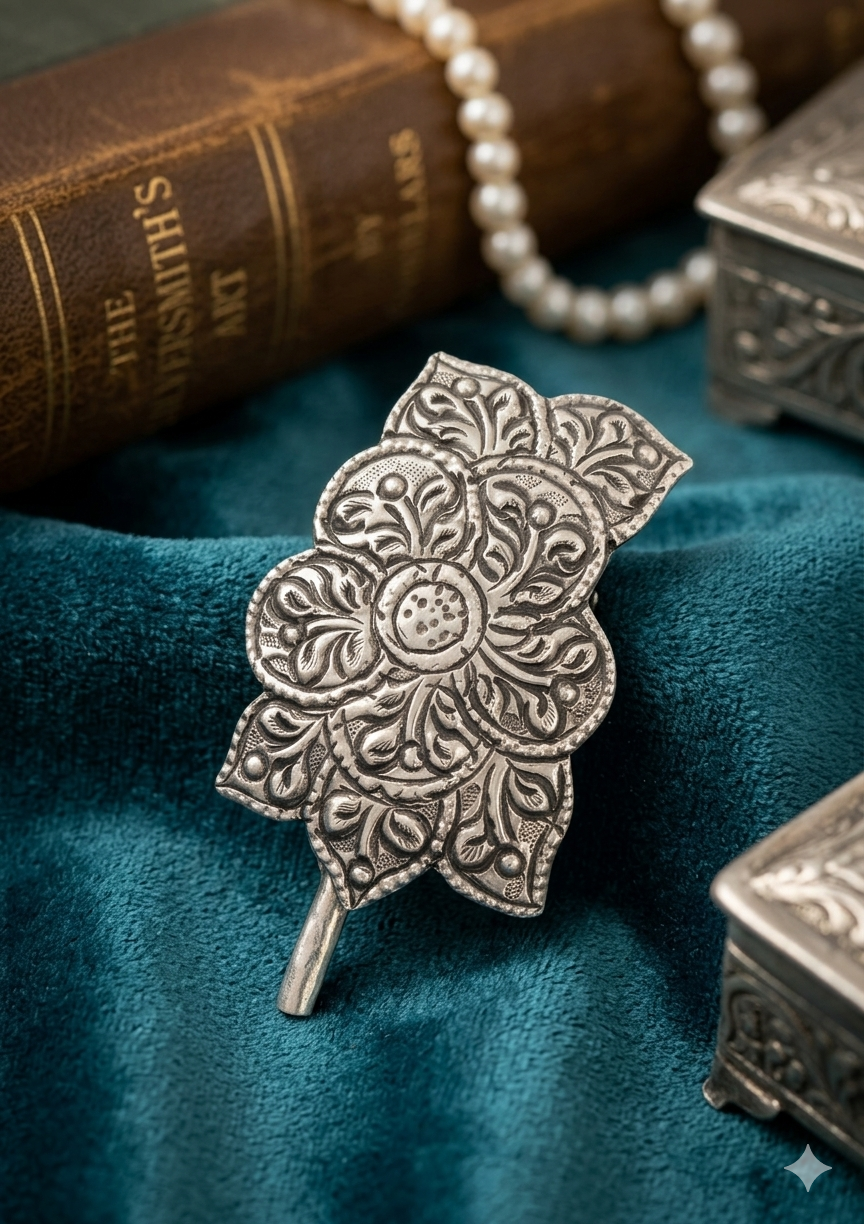 Sp Silver Jewellery Silver Flower & Leaf Clip. Designed with delicate floral and leaf patterns, this piece reflects natural beauty with a touch of traditional artistry. Perfect for both everyday wear and festive occasions, it holds your hair securely while enhancing your look with a soft, feminine elegance