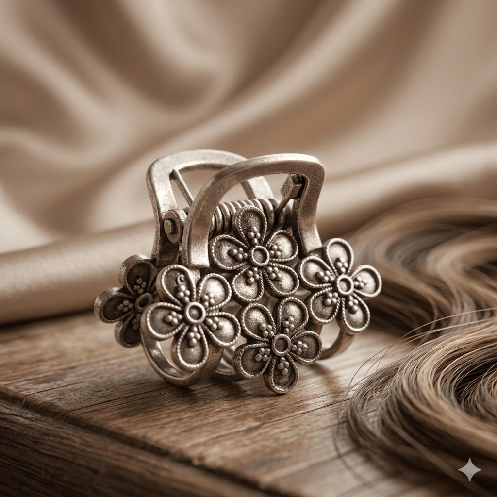 Pure Silver Oxidised Flower Design Hair Clip Clutcher. Designed with intricate floral patterns and a vintage oxidised finish, this piece perfectly blends ethnic charm with modern style.