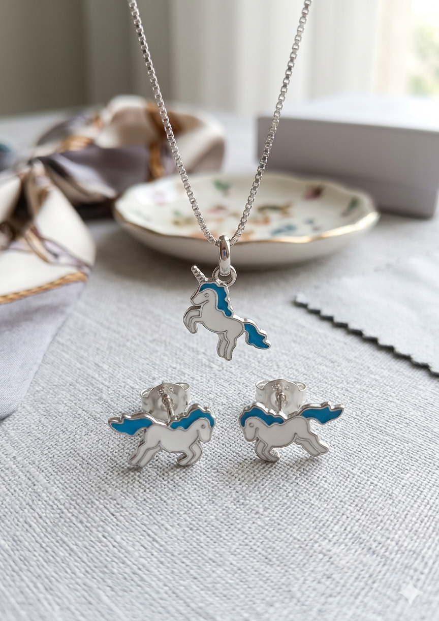 Pure Silver Unicorn Blue Enamel Collection Set ๐Ÿฆ„๐Ÿ’™. Beautifully crafted in 92.5 sterling silver, this charming set features a cute unicorn design highlighted with vibrant blue enamel detailing, making it perfect for kids and unicorn lovers alike.
