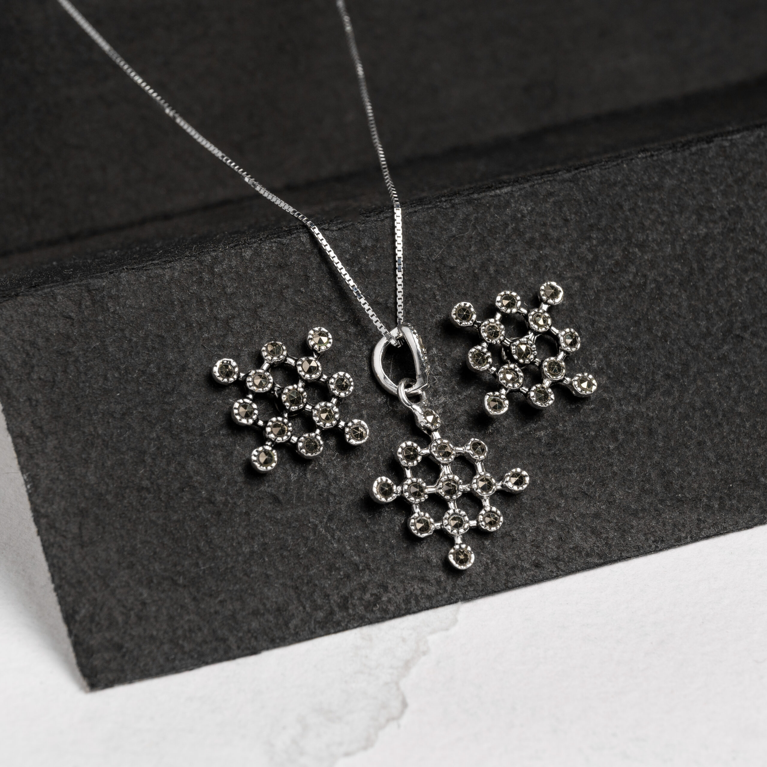 Sp Silver Jewellery Silver Marcasite Chain Pendant Earrings Set. Crafted in polished silver and adorned with shimmering marcasite stones, this beautifully matched pendant and earrings set offers timeless charm with a touch of old-world glamour. Perfect for festive occasions, office wear, or elegant evenings, it complements both traditional and contemporary outfits effortlessly.